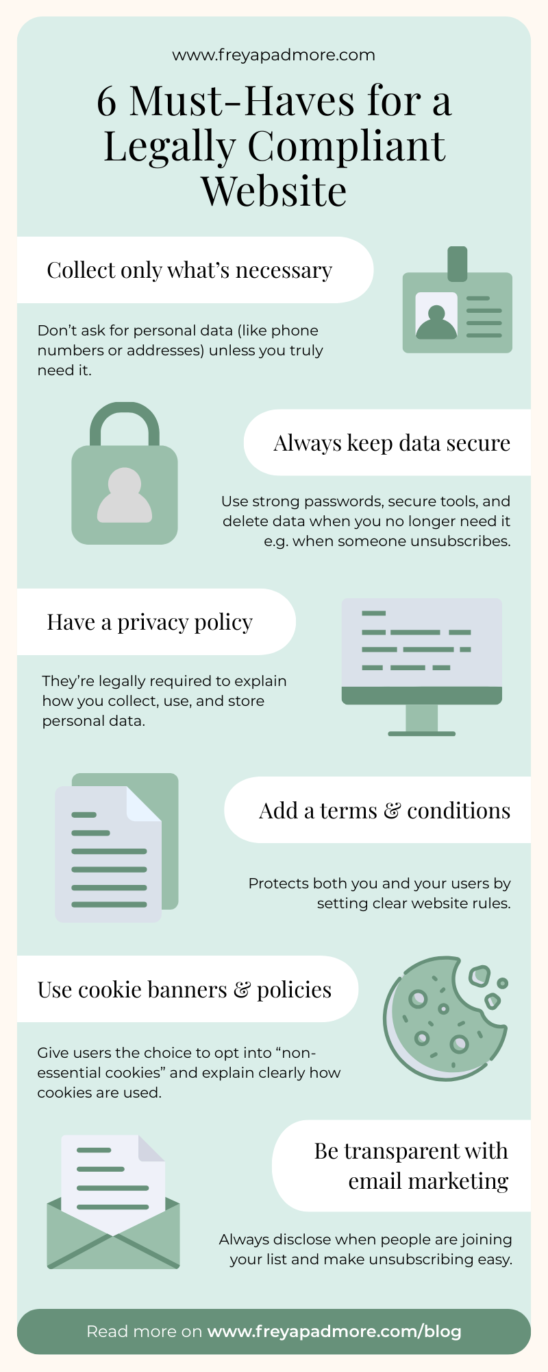 I personally use Termageddon for my privacy policy, terms & conditions, cookie policy, and cookie consent tool. It keeps everything in one place and automatically updates when laws change. If you’d like to try it, you can use the code FREYA for 10% off your first year. (That’s an affiliate link, but I only recommend it because I use and love it myself.)